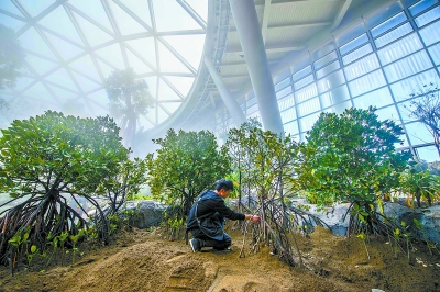 北京世园会植物馆首次在北方温室营造红树林生长环境,支持红树林以及其他热带植物的生长,还可以营造潮起潮落的效果。本报记者潘之望摄