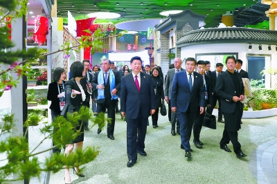 习近平和贵宾们饶有兴致地观看、交谈。习近平指出,中国馆体现了厚重的地域文化,讲述了美丽的园艺故事,汇聚了中国生态文明建设成果,不仅让我们欣赏到美妙的园艺,更体现了中国与世界追求绿色生活、共享发展成果的理念。