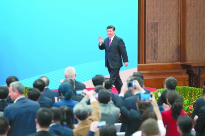 四月二十七日,第二届“一带一路”国际合作高峰论坛在北京雁栖湖国际会议中心举行圆桌峰会,国家主席习近平主持会议并致开幕辞。圆桌峰会闭幕后,习近平会见中外记者,介绍第二届“一带一路”国际合作高峰论坛圆桌峰会情况和主要成果。这是习近平步入记者会现场。新华社记者姚大伟摄