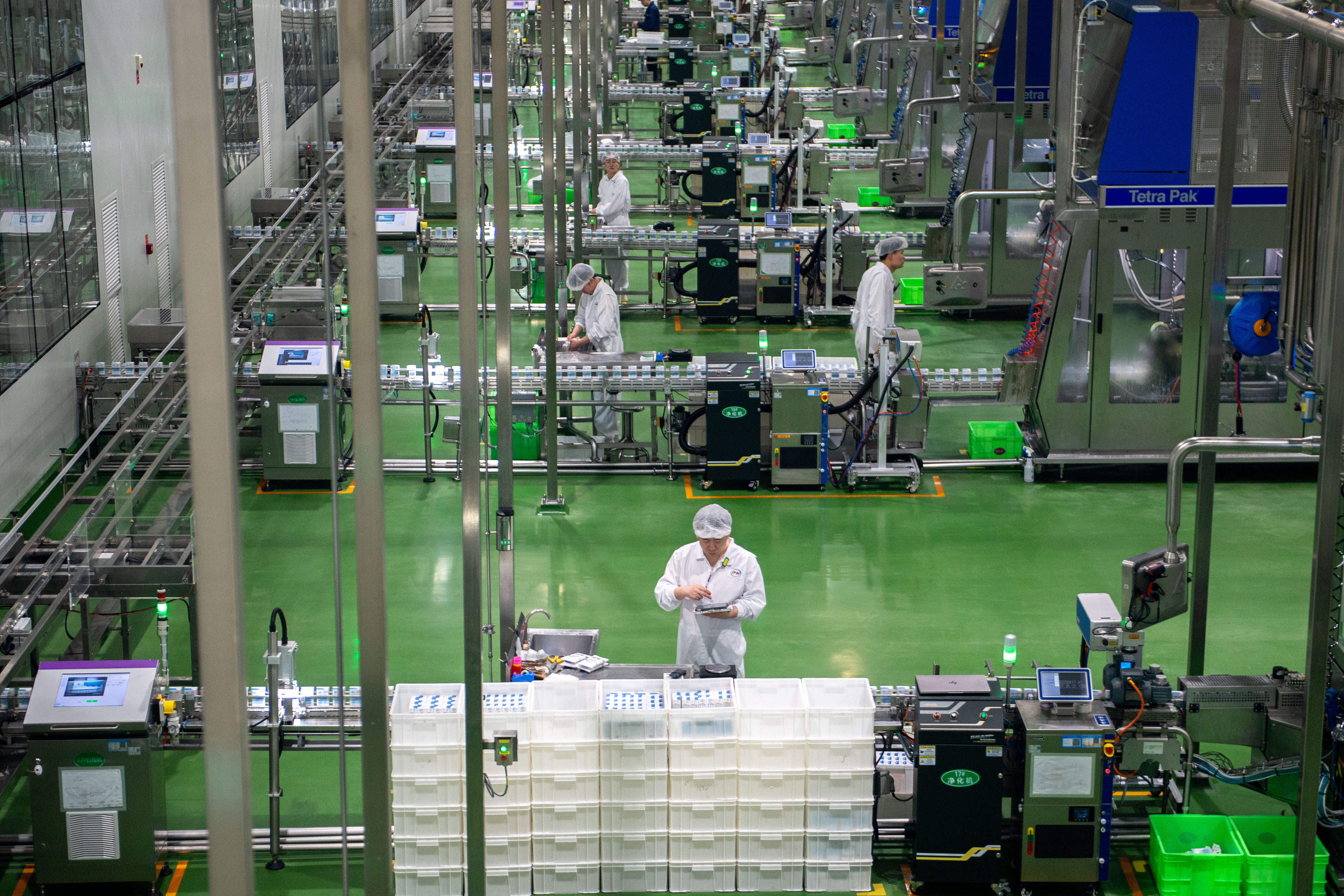 2025年4月17日,在内蒙古呼和浩特市土默特左旗,工人在伊利现代智慧健康谷全球智能制造产业园灌装车间内工作。新华社发(李心逸摄)