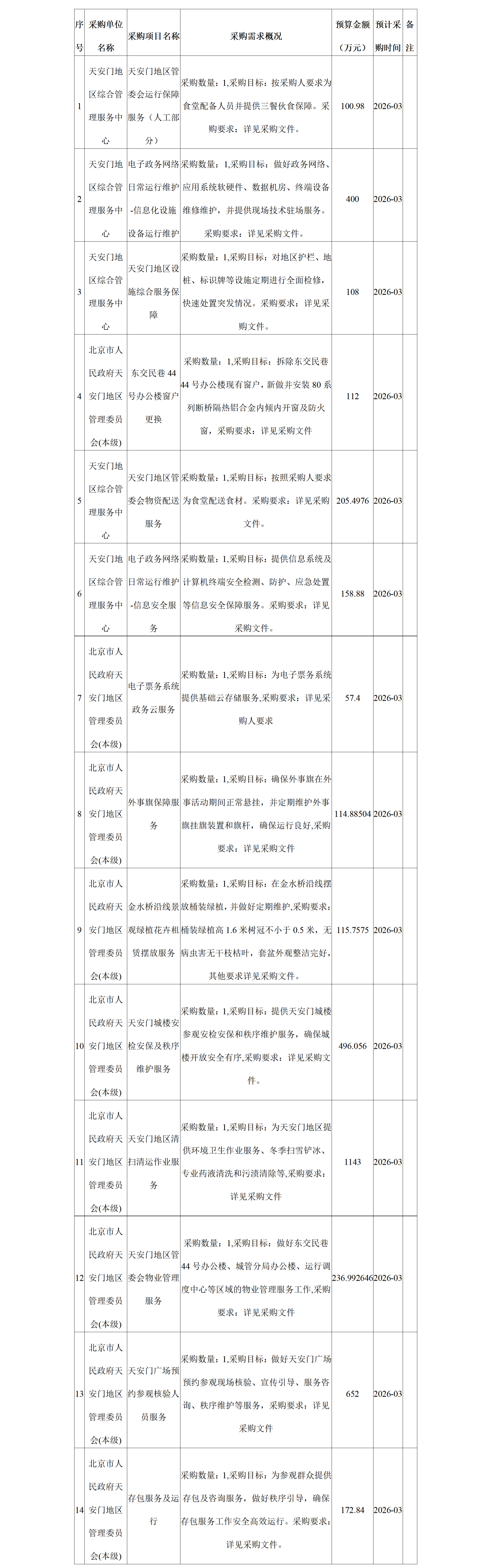 为便于供应商及时了解政府采购信息,根据《财政部关于开展政府采购意向公开工作的通知》(财库[2020]10号)等有关规定, 现将北京市人民政府天安门地区管理委员会 2026年3至5月采购意向公开如下: