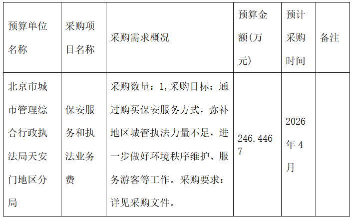 为便于供应商及时了解政府采购信息,根据《财政部关于开展政府采购意向公开工作的通知》(财库[2020]10号)等有关规定,现将北京市城市管理综合行政执法局天安门地区分局2026年1至12月采购意向公开如下: